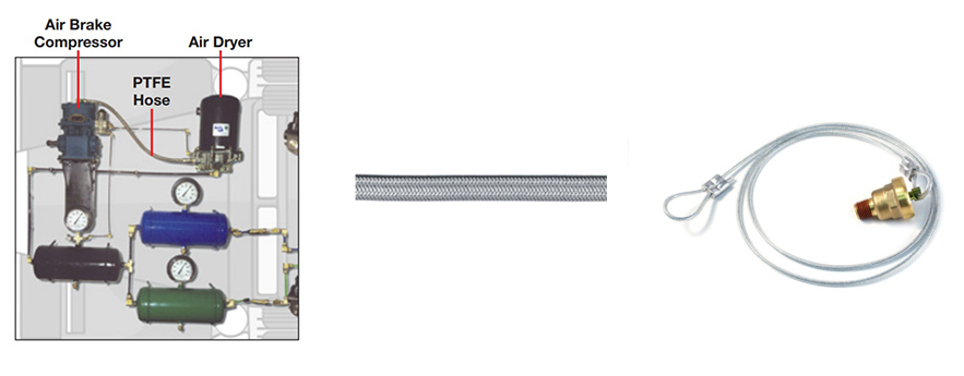 ระบบคอมเพรสเซอร์ประกอบด้วยสามส่วนประกอบ: คอมเพรสเซอร์เครื่องเป่าอากาศและท่อเชื่อมต่อหรือท่อ ไม่สามารถใช้การไหลของอากาศที่เกิดจากคอมเพรสเซอร์จนกว่าจะมีการปรับอากาศ มีสองปัญหาเกี่ยวกับอากาศบีบอัดดิบ ก่อนอื่นอากาศที่มาจากคอมเพรสเซอร์ร้อนเกินไปสำหรับท่อมาตรฐาน ท่อ PTFE ใช้ในการเชื่อมต่อคอมเพรสเซอร์กับเครื่องอบแห้งเพราะสามารถจัดการอุณหภูมิสูงถึง 400 ° F ท่อ PTFE สามารถระบุได้ด้วยถักเปียสแตนเลสที่ทำหน้าที่เป็นทั้งฝาครอบและการเสริมแรง